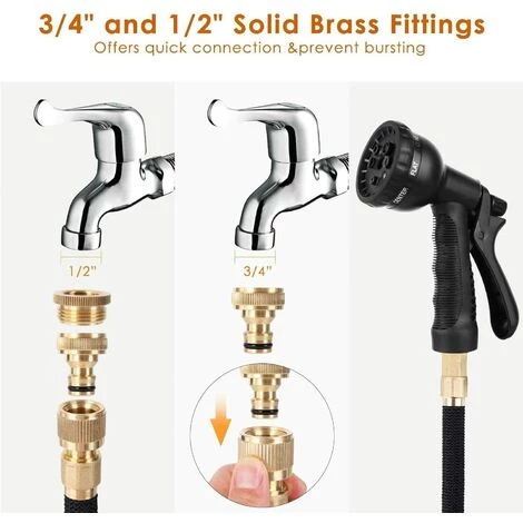 - Conception flexible: Ce tuyau d’arrossage peut être étendue et étendue. Lorsque le tuyau d’eau est raccordé à l’eau, le tuyau de pression d’eau (3 à 12 bars) est dilaté rapidement jusqu’à trois fois sa longueur et retrouvé sa longueur initiale en quelques minutes lorsque l’eau est drainée. Assurez-vous juste qu’il y a assez de pression d’eau pour étirer le tuyau. Il est très pratique pour votre utilisation et votre stockage, économisant de l’espace.