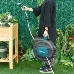 Tuyau d’eau de 30 mètres avec enrouleur automatique et support mur giratoire. La meilleure solution pour arroser de manière efficace de grandes surfaces de votre jardin ou terrain et avoir toujours votre tuyau propre et à sa place. Ça en sera fini d’avoir votre tuyau emmêlé et impossible à dérouler¡ Recommandé pour une utilisation professionnelle et /ou industrielle.