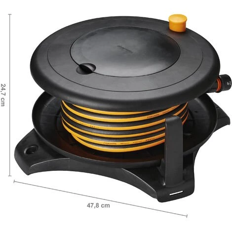 Kit complet de haute qualité comprenant un enrouleur et un chariot pour tuyau, des tuyaux d’arrivée et de sortie durables, des buses et des raccords pour un arrosage facile de grands jardins, terrasses et des cours.