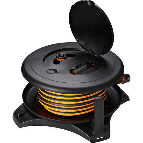 30 m de tuyau de sortie pour faciliter l’enroulement et le déroulement et 1,5 m de tuyau d’arrivée Ø 13 mm (1/2″), roues rembourrées et poignée télescopique pour faciliter le déplacement, connecteur de robinet universel à trois filets