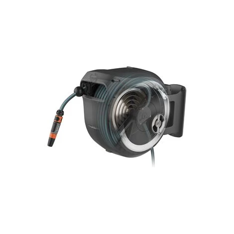 La technologie RollControl fonctionne grâce à un frein centrifuge et un ressort de haute qualité afin de garantir un enroulement toujours fiable et homogène du tuyau d’arrosage. De plus, le guide-tuyau intégré évite les torsions lors de l’enroulement du tuyau d’arrosage.