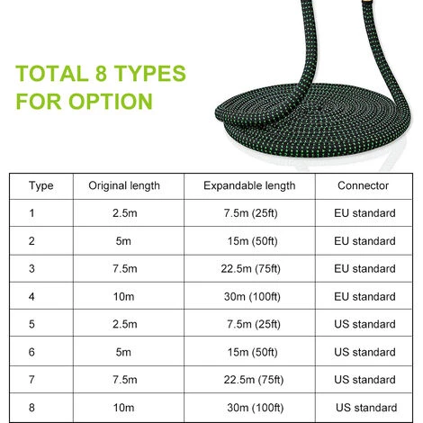 Tuyau extensible : le tuyau télescopique commence très court, se dilate automatiquement jusqu’à 3 fois sa taille avec une pression standard lorsque l’eau est allumée, revient à sa longueur compacte d’origine lorsque l’eau est éteinte.