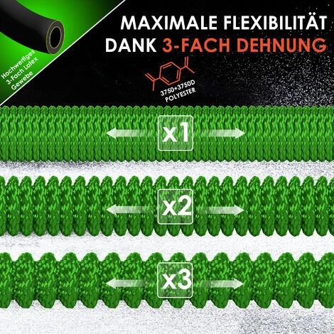 La longueur d’origine s’élève à 5 mètres, 7,50 mètres, 10 mètres ainsi que 15 mètres (selon le modèle choisi) – après extension du tuyau (dès qu’il est rempli d’eau), vous avez une longueur maximale de 15 mètres, 22,5 mètres, 30 mètres ainsi que 45 mètres (selon le modèle choisi).