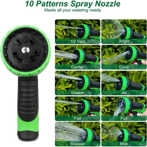 10 buses de sécurité fonctionnelles : par rapport à la plupart des 9 modèles de buses de tuyau, notre buse avec eau dispose de 10 modèles (douche, plat, brumisateur, Soaker, Full Center, Angled Cone, Jet, 1/2 Green) pour plus de choix. Le revêtement extérieur caoutchouté est antidérapant et confortable. Lunette tournante pour un choix facile du type de buse. Poignée ergonomique pour une utilisation sans effort