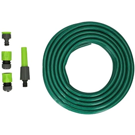 Lot 5 pièces : tuyau d’arrosage 15m, diamètre 14mm et 2 embouts de racord, un connecteur et lance.