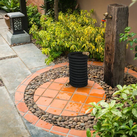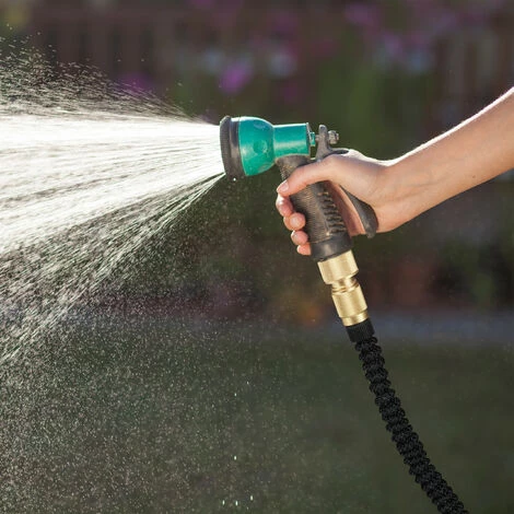 Ce tuyau d’arrosage flexible est idéal pour un arrosage confortable de votre jardin ou de votre balcon. Il vous simplifiera le soin quotidien que vous devez apporter à vos fleurs, plantes d’agrément ou au nettoyage de vos mobilier d’extérieur. De plus, le tuyau ne souffrira pas de plis ou de dommages grâce à sa couche extérieure en polyester. Le tuyau est également extensible : selon la pression de l’eau il s’étirera de 5 jusqu’à 15 mètres, ce qui lui permet d’économiser de la place lors du rangement. Avec les adaptateurs, vous pourrez connecter votre tuyau aux robinets de votre choix.