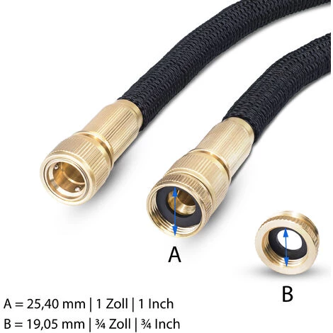Des adaptateurs pour le raccordement au robinet sont déjà inclus pour les tailles 1 pouce et ¾ pouce. La technologie éprouvée et résistante à la pression des tuyaux flexibles est absolument résistante au pliage et le tuyau d’eau extensible est donc toujours exempt de pliage.