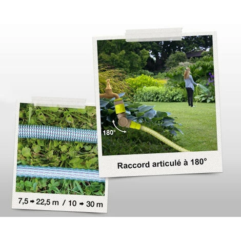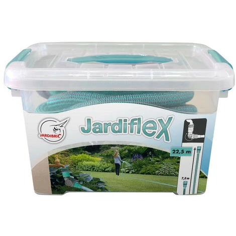 Le tuyau d’arrosage extensible et rétractable JardiFlex est un produit haut de gamme grâce à un tissage en maille renforcée Dacron 3300D, un latex 3 couches et un raccord articulé à 180, qui évite tout effet de pincement.
